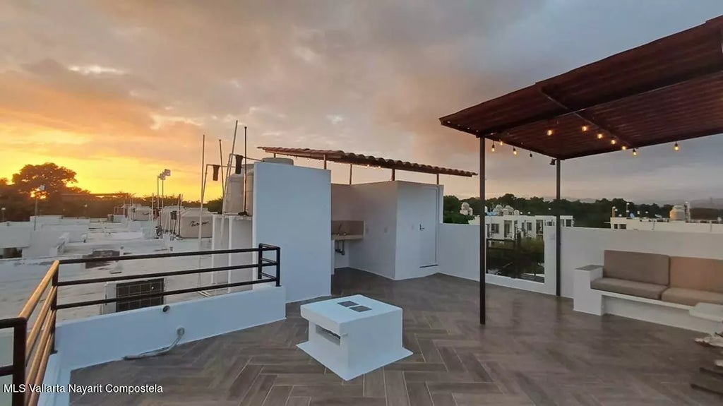 Casa duplex o departamento en planta alta con 3 recamaras, estancia con minisplit, un bano completo, cocineta integral con barra de granito y refrigerador nuevo, patio de servicio; Terraza en azotea (en propiedad) de 47 m2 con sala de concreto con cojines, medio bano, area de cocina con barra y parrilla para BBQ y tarja; todo con cubierta de teja, iluminacion y acabados.