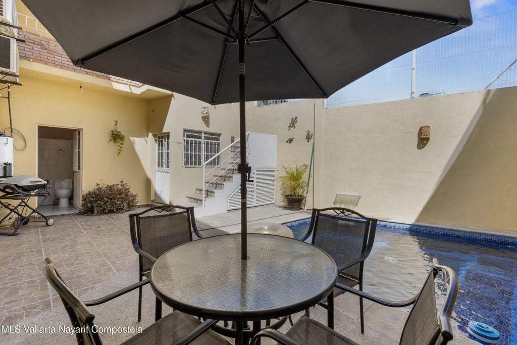 Casa estilo mexicano, ubicada en el corazon de la Cruz de Huanacaxtle a una cuadra de la entrada a la Marina y al famoso mercado de artesanias de los sabados, la casa cuenta con patio frontal, amplia cochera techada, sala, cocina-comedor, cuarto de lavado, patio trasero con alberca privada y amplia recamara con bano en la planta baja; en la planta alta recamara con bano y vestidor y una terraza con vista a la alberca, ventiladores de techo y aire acondicionado. Mexican-style house, Located in the heart of Cruz de Huanacaxtle, one block from the entrance to the Marina and the famous Saturday craft market, the house has a front yard, an oversize covered garage, living room, kitchen-dining room, laundry room, a private pool at the backyard. On the first floor, you will find a large bedroom with a bathroom, upstairs a bedroom with a bathroom and dressing room, and a terrace overlooking the pool, ceiling fans, and air conditioning.