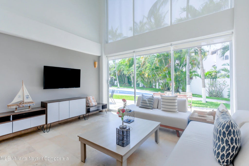 Beautiful two-level ground-floor condo in Terra Kite, one of Nuevo Vallarta's most exclusive developments. 2,483 sq ft, 3 bedrooms (one on the main floor) with A/C and fans, 2 full baths, kitchen with breakfast bar, and living room with pool and garden view. Luxury amenities: beach access, pool, 24/7 security, and gated entry. Minutes from restaurants, marina, and golf course. /Hermoso departamento de 2 niveles en planta baja en Terra Kite, con 230.70 m, 3 recamaras (una en planta baja) con A/A y ventiladores, 2 banos, cocina integral y sala con vista a la alberca y jardin. Amenidades de lujo, acceso a playa, alberca y seguridad 24/7.