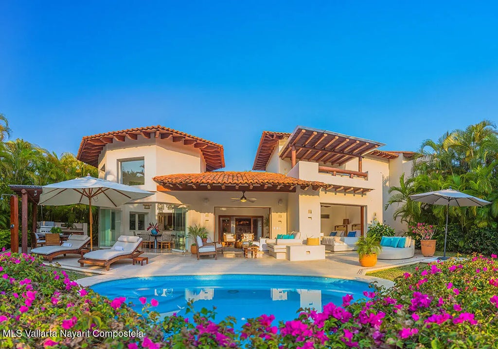 Where coastal elegance meets effortless livingExperience the essence of Punta Mita in this beautifully appointed two-story villa, blending contemporary design with the relaxed sophistication of coastal living.Las Palmas Villa 25 offers three spacious bedrooms plus a versatile flex room, along with 3.5 bathrooms and generous indoor-outdoor spaces that capture the spirit of tropical luxury.The main level welcomes you with expansive living and dining areas that open seamlessly onto a large terracea"the perfect setting for al fresco dining, sunset cocktails, or a refreshing dip in your private heated plunge pool. A gourmet kitchen, interior courtyard with water feature, and Viking BBQ complete this refined entertaining space.The primary suite on the main level features a walk-in closet, indoor and outdoor showers, and a private terrace overlooking the lush gardens. Two additional guest bedrooms on this level offer ample comfort and privacy, each with its own terrace or garden access. The flex room provides a versatile space ideal for an office or additional guest accommodation. Upstairs, the grand master suite invites relaxation with its lounge area, dual walk-in closets, luxurious en-suite bath, and a private covered terracean intimate hideaway surrounded by the beauty of Punta Mita. Fine stone flooring, high-end finishes, and thoughtful details are found throughout. The villa also includes a spacious enclosed garage with room for a car, golf cart, and additional storage. Located within the exclusive gates of Punta Mita, Las Palmas Villa 25 offers privileged access to the community's world-class amenities, including beach clubs, golf courses designed by Jack Nicklaus, and the five-star lifestyle that defines this iconic destination. Las Palmas Villa 25 - your private sanctuary in the heart of Punta Mita.